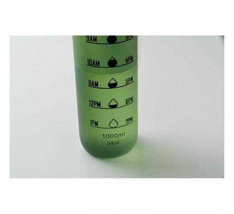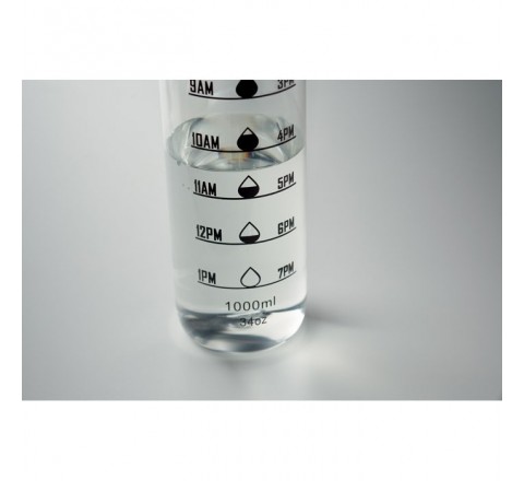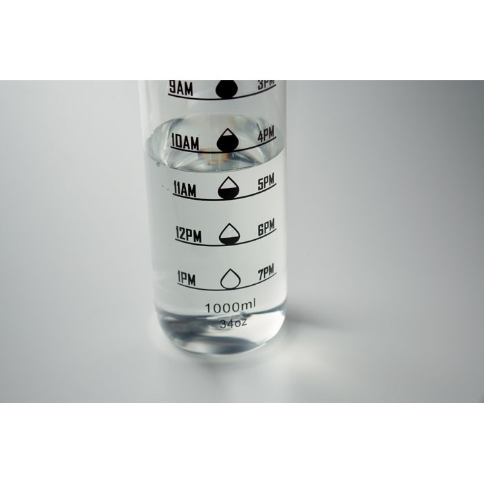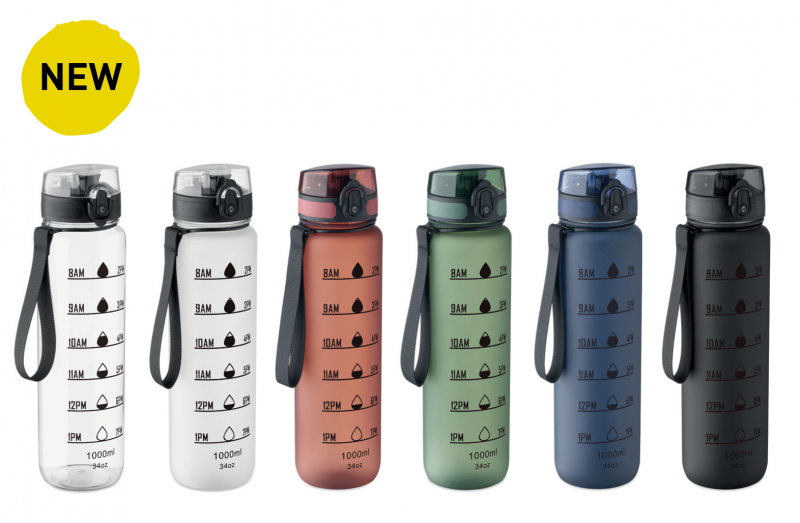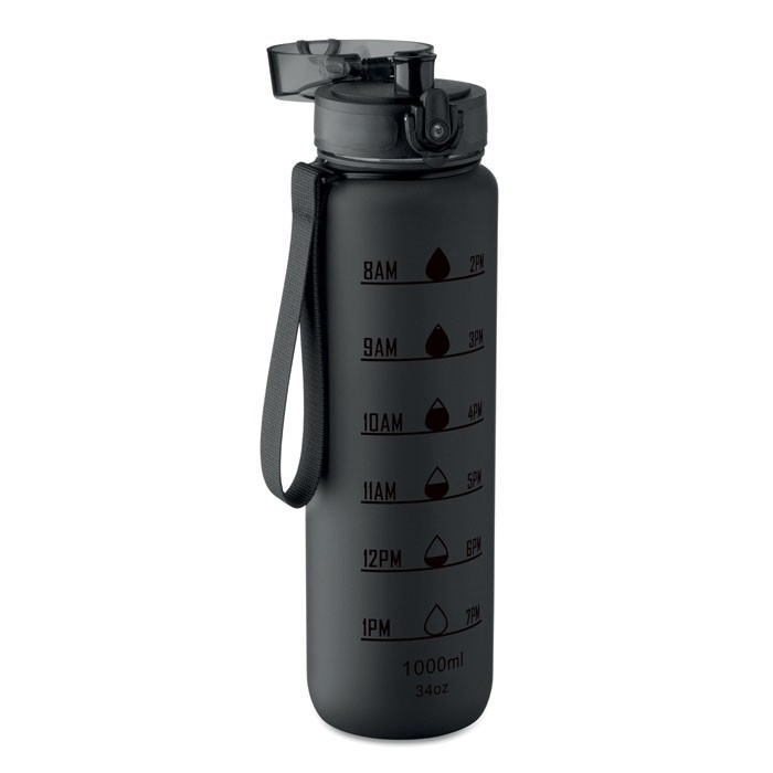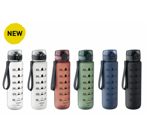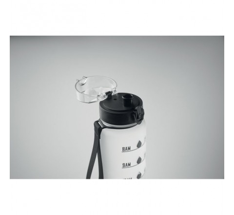 Sportowa butelka na wodę z RPET, motywujące oznaczenia czasu, otwierana jedną ręką klapka, blokada bezpieczeństwa i pasek do przenoszenia. Nie przecieka. Pojemność: 1 l.