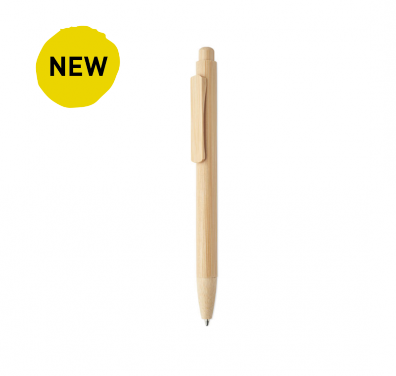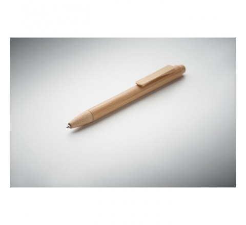 Przyciskany długopis z bambusowym korpusem, końcówką, klipsem i obudową. Niebieski tusz.